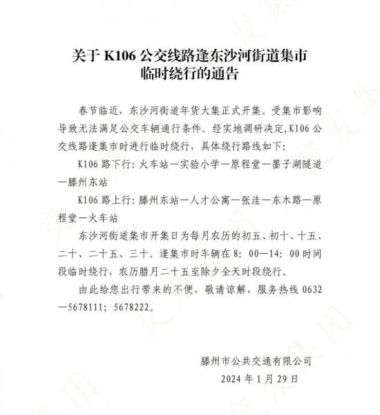 關(guān)于K106公交線路逢東沙河街道集市臨時(shí)繞行的通告