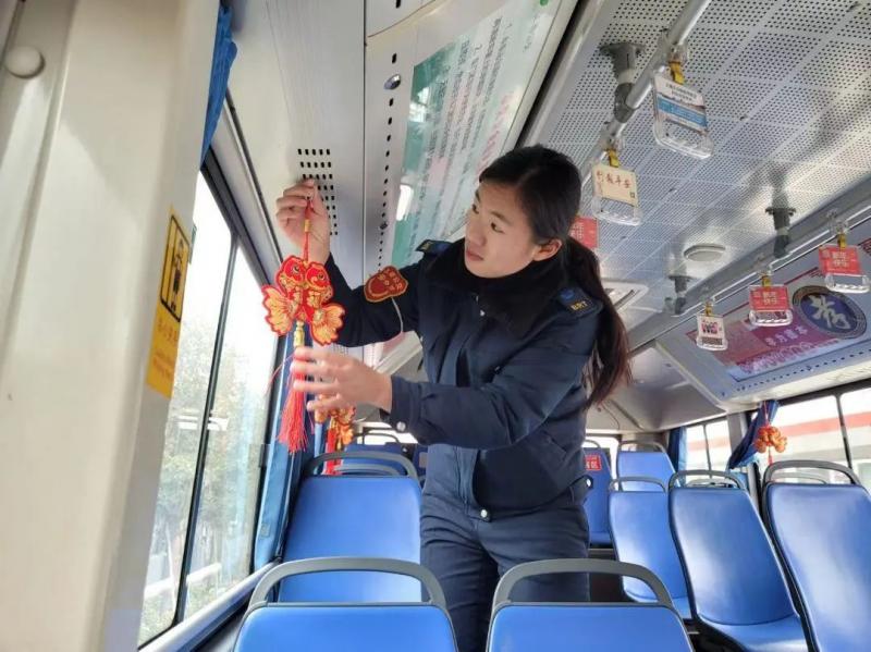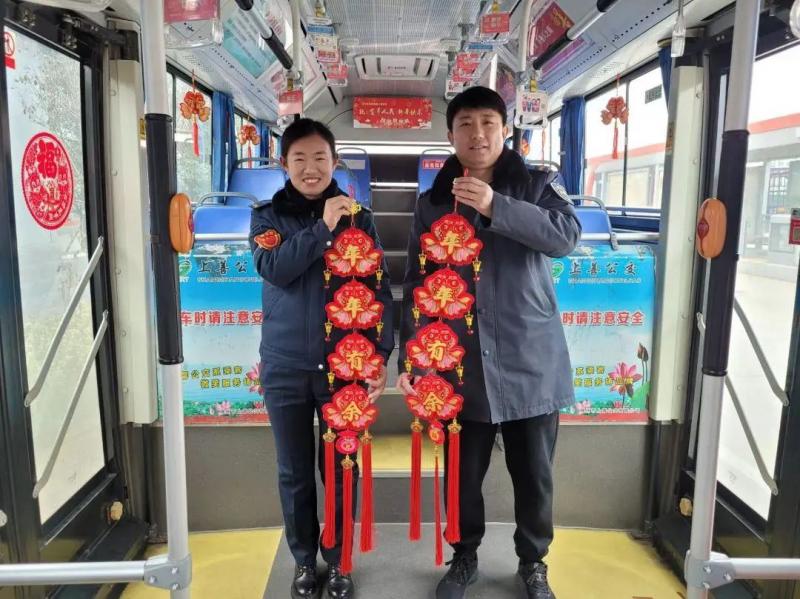 公交車廂內(nèi),工作人員將其布置得年味滿滿,在車頂、兩側(cè)車窗、車廂后尾部“全景呈現(xiàn)”春節(jié)喜慶氛圍,一張張精美的窗花、福字細(xì)心地貼在車窗上,一個(gè)個(gè)小紅燈籠高高掛起,車廂后部還懸掛了新年祝福,讓人倍感喜慶和溫暖。同時(shí),5處有人值守站臺(tái)張貼了春節(jié)的彩色海報(bào)、宣傳標(biāo)語(yǔ)、橫幅,懸掛了紅彤彤的大燈籠,讓更多的旅客感受到棗滕B6線熱情的服務(wù)和滿滿的年味氣氛,感受到“家”的氛圍。