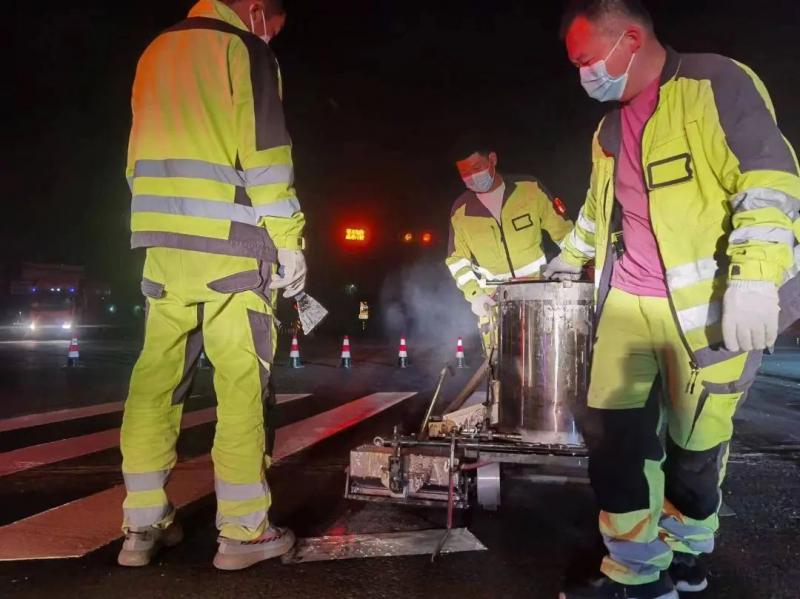 為確保白天道路交通秩序,公司施工隊(duì)伍將標(biāo)線施工安排在夜間進(jìn)行。在交通晚高峰過后,路上車流相對減少的情況下,施工人員便開始忙碌起來,設(shè)置好施工標(biāo)志和警示標(biāo)志,清除施工區(qū)域的障礙物,按照預(yù)定的劃線方案,使用專業(yè)的道路劃線機(jī)械和人工輔助進(jìn)行施工,經(jīng)過連日持續(xù)夜間奮戰(zhàn),高效完成了施工任務(wù)。
